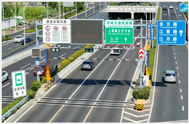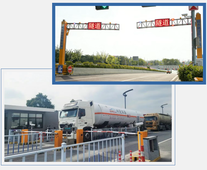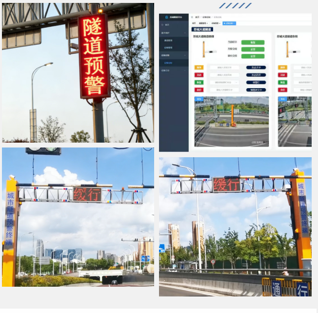 该系统已在苏城大道城市隧道成功落地应用:隧道前1-2公里设置多组预警屏,形成声光视觉多重警示;隧道口双侧智能阻拦设备,集升降闸杆与